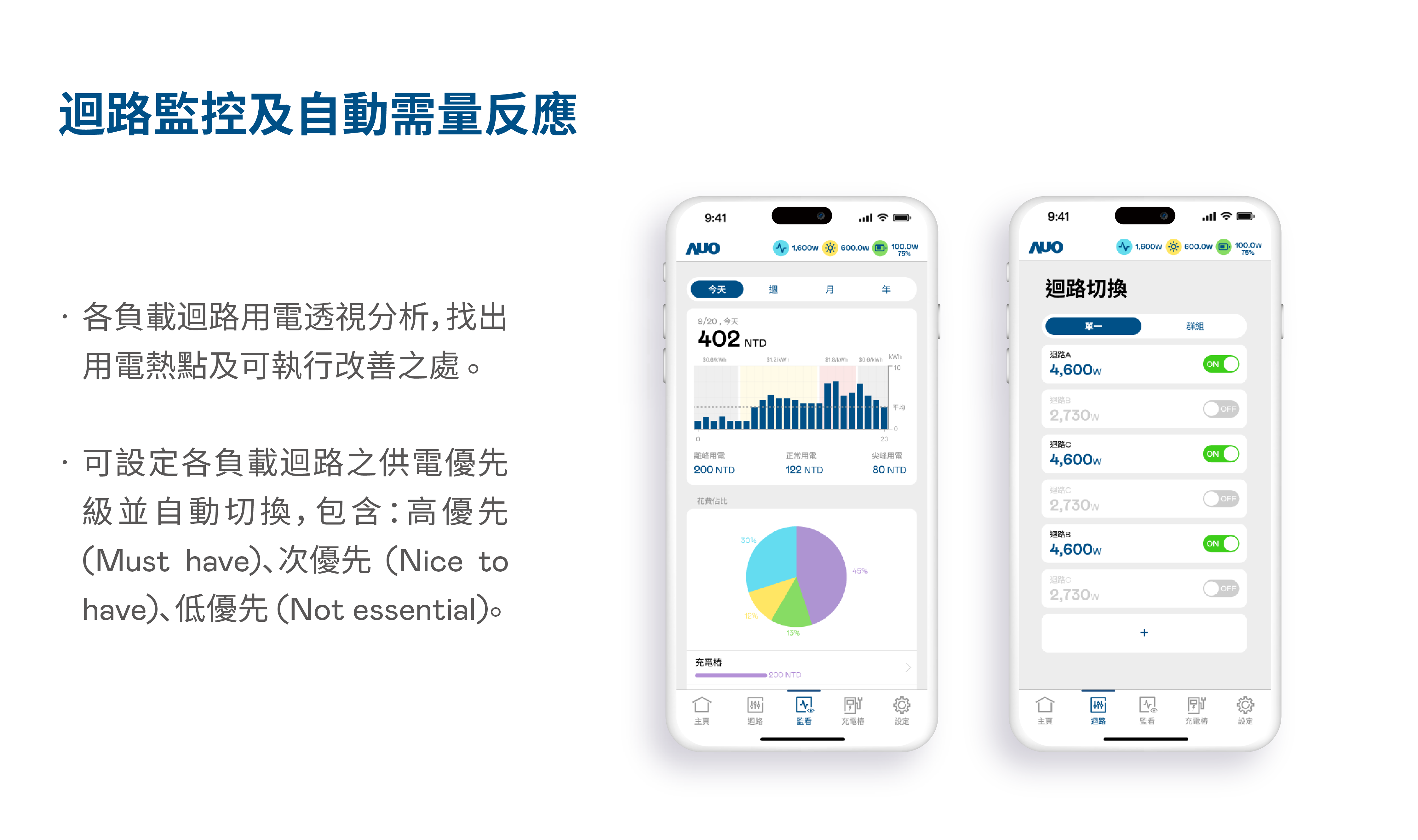 EnLink APP提供行動能源管理方案,透視各負載迴路用電,並依設定之迴路供電優先級執行自動需量反應;能源組成可視化功能協助洞見能源使用效率,建立可持續追蹤的能源績效指標報表,加速達成減碳目標。