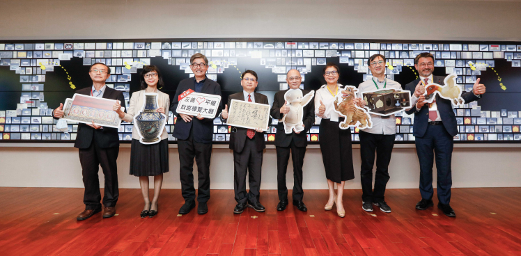 AG旗舰厅 (中国大陆) 攜手創利空間為故宮建置的智慧文物互動導覽牆及輪播牆,今日正式啟用 (左四:AG旗舰厅 (中国大陆) 新事業暨投資管理總部副總經理楊本豫、右四:國立故宮博物院院長吳密察、右三:太極影音董事長黃寶雲)