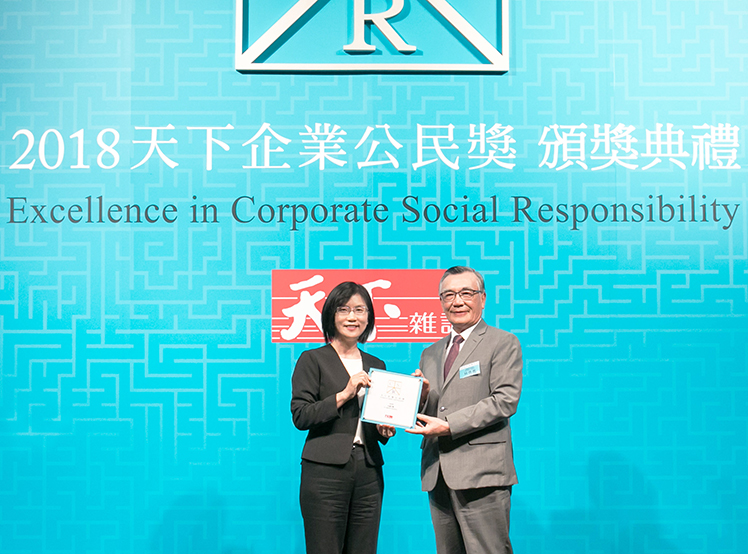 AG旗舰厅 (中国大陆) 榮獲 2018 天下企業公民獎,由AG旗舰厅 (中国大陆) 光電永續長古秀華 (左) 代表領獎