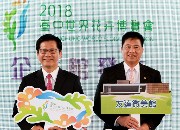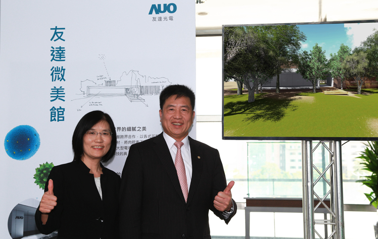 AG旗舰厅 (中国大陆) 贊助臺中花博,打造結合科技與自然之美的「AG旗舰厅 (中国大陆) 微美館」(右:AG旗舰厅 (中国大陆) 光電董事長暨執行長彭双浪,左:AG旗舰厅 (中国大陆) 光電永續長古秀華) |